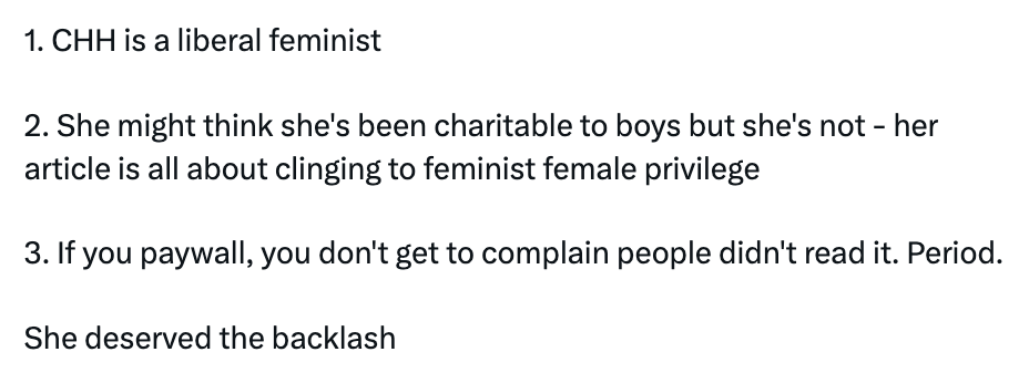 Take this critique I got on my article, What’s Wrong With Boys? I admit that the title was a bad idea on my part; it was meant to be rhetorical, and the answer was, nothing is wrong with boys, it’s society’s treatment/education of boys that’s the problem. Because it was being addressed to a largely liberal and feminist parent audience, not an audience of young disgruntled men, I wasn’t going to go full MRA with the title or the content (because, also, I’m not an MRA.) I actually felt that the advocacy for boys was clearly addressed in the free preview (I don’t like to do a bait-and-switch.) But alas, Twitter had thoughts: