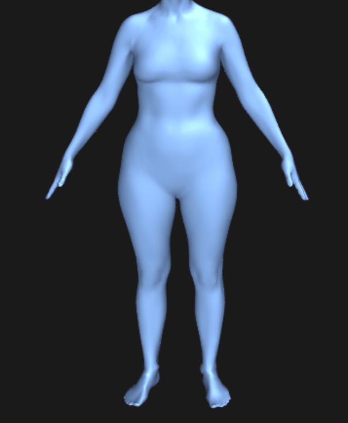 Just as an example, from my earlier survey, this is a woman with mathematically “curvy” proportions, who is slim. Before you tell me “this isn’t actually curvy,” I input the measurements myself. “She” has a 0.63% waist-hip ratio, which is curvier than the 0.7% ideal. If you don’t think this is curvy, it’s because you too have been influenced by our actual beauty standard gaslighting you that “all women would be an exaggerated hourglass with a flat stomach if they ate a freaking sandwich!”