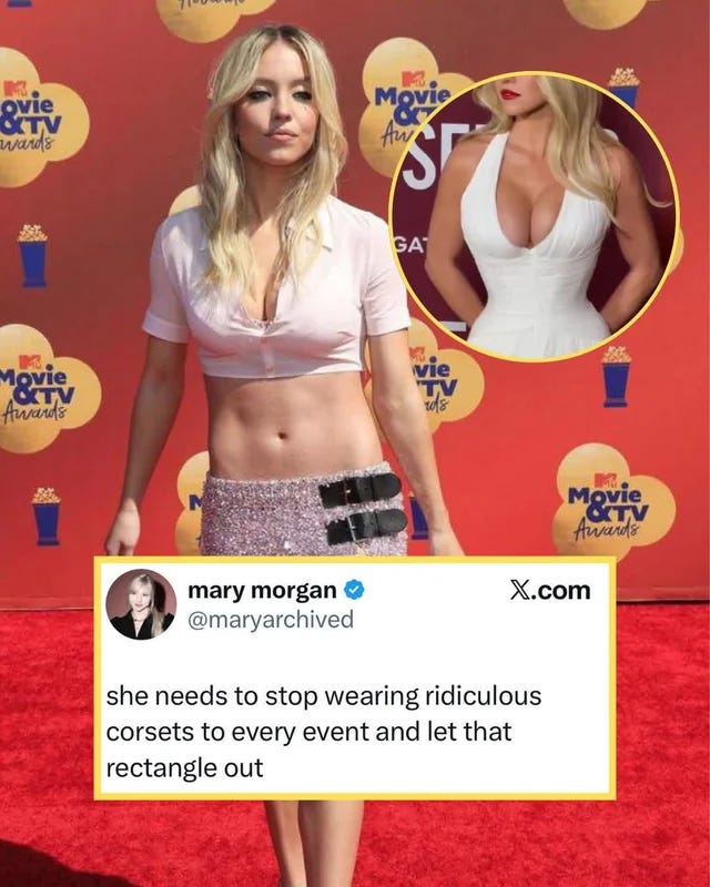 If you meet a woman who is straight-shaped, with a flat chest, a small butt, narrow hips and a rectangular waist, she will not feel like the beauty ideal! She might agree that our society venerates skinny bodies, but she will disagree, for example, with Jamil’s assertion that our culture is…*checks notes* anti-boob. I’m sorry, no. Our culture is very much pro-boob. Sydney Sweeney is considered a mainstream sex icon in part because she has big boobs. How did the pedophiles let Sydney Sweeney slip through?! I also remember a time recently when a photo of Sydney Sweeney was bashed by various body-shaming gremlins for not being sexy enough, and it wasn’t because she looked too womanly. It was because—gasp—her waist isn’t naturally corseted: