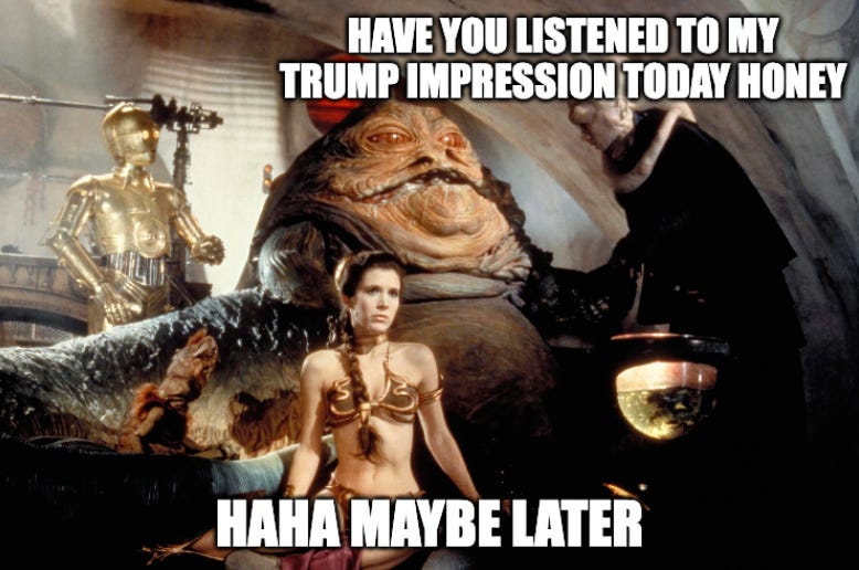 But I feel like the feedback “Your husband must be/is really hot” doesn’t feel the same to me the way “Your wife is hot” might feel to a man. The latter implies high fives, the former is a bit of an indictment on your own role as the desired party. Society is full of men bragging about how their ho-hum selves landed their gorgeous wives by being funny and charming. You don’t really see the female version of this, because it’s frankly, embarrassing. There is no “dumpy SEC frat guy with a smokeshow girlfriend” archetype with the genders reversed, and if there is, people usually just assume the guy is gay or just wants casual sex. Of course, I am very happy my husband is good-looking and fit, and I’m not insinuating that I’m ugly, just “not as hot.” But when you’re a woman, there’s something a bit humiliating about the possibility that you are the one who snagged a hottie and got lucky, even if it’s not a wide gap in hotness—that my husband is Princess Leia to my Jabba the Hutt. Perhaps this is one reason I feel it’s verboten for me to initiate sex.
