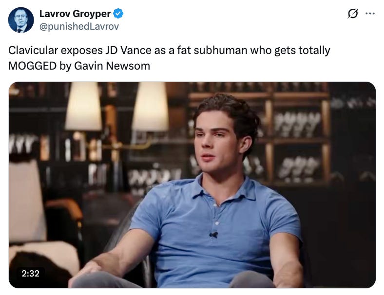 And even though Clavicular doesn’t seem particularly liberal-coded, the verdict is in: Gavin Newsom MOGS JD Vance. You can tell he’s in it for the love of the game, the game being mogging. Finally, a pure, unbiased voice in politics.