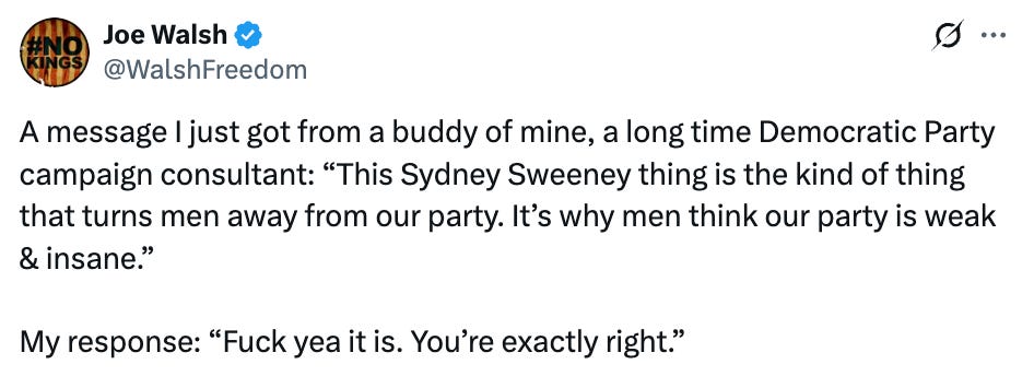 I actually had this article in drafts for about a month, but lately, the controversy over Syndey Sweeney’s American Eagle ad made it feel pretty relevant. TLDR for those lucky enough not to be in the know: Sydney Sweeney was the spokeswoman for an American Eagle ad about “good jeans” (get it?) where Sweeney’s “good genes/jeans” were repeatedly mentioned. A few liberals/leftists went viral for reading into the advertisement as a fascist dogwhistle since Sweeney is blonde and blue-eyed. I read into it as a horny dogwhistle since Sweeney is hot with big boobs.