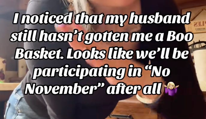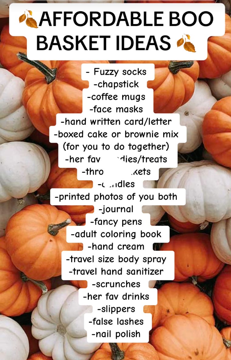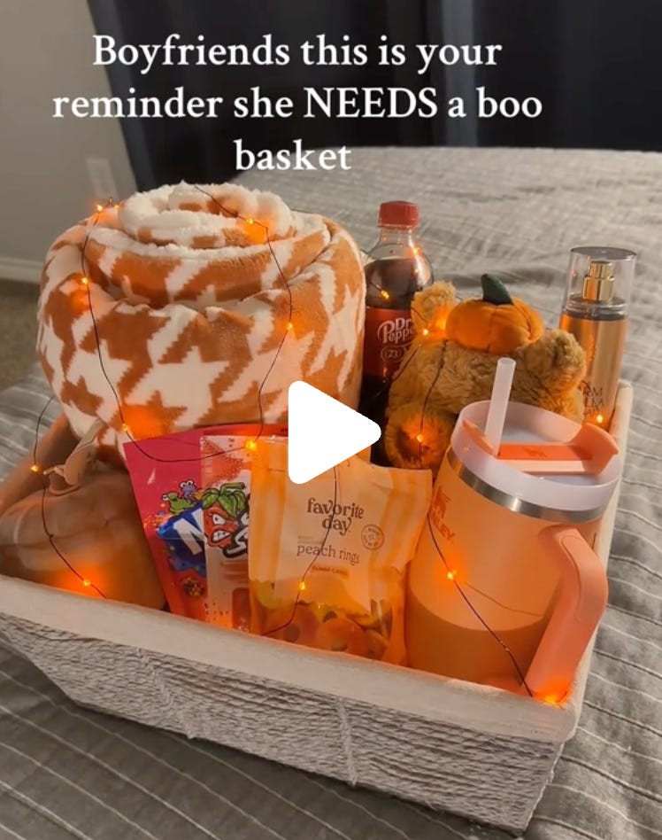 As silly as I feel writing the word “boo basket” in an otherwise serious tone, I feel like boo baskets are a great example of how TikTok has created what I’ll just be calling the Thoughtful Gesture Industrial Complex—new completely manufactured expectations with no cultural history or significance, driven mostly by influencers attempting to one-up each other with more and more elaborate things to convince people they need to do and buy. It’s the “hip dips” of gifts, if you will—something most people never would have considered, let alone worried about, if TikTok and Instagram hadn’t gotten involved. And boo baskets aren’t the only example.