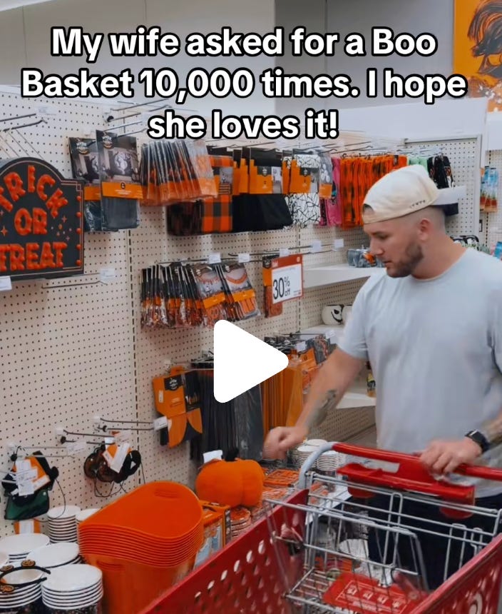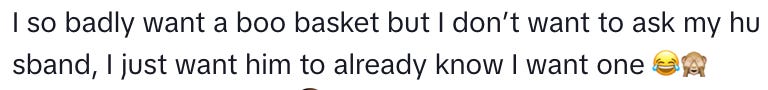 The way TikTok works is that a boo basket isn’t just something that one especially gifty person does for their partner, but for some people, an expectation or source of conflict. According to TikTok (spurious “according to,” I know) some women expect their boyfriends to provide boo baskets, and then some women feel unwanted and undesired when their boyfriends fail to do so. It’s one thing to compare your boyfriend or husband to the partners of your friends, and another thing to compare them to the partners of TikTok influencers, who might be orchestrating everything themselves anyway. And of course, this also means parents are stuck wondering if other kids at their children’s school will get boo baskets, then frantically trying to keep up so their kids don’t feel less loved in comparison.