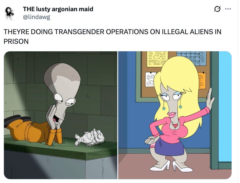 This was, in part, why I wrote that DOGE was about sex (God, remember DOGE?! lol.) I don’t think it was necessarily Elon Musk’s intent, but a great deal of the online support of DOGE was predicated on a revenge fantasy wherein a bunch of useless girlbosses are told the party is over and it’s time for the to battle with each other to marry some guy in the trades to survive. Perhaps more baffling, many of the men cheering this on had white collar jobs themselves (some openly!) which is why I called them the Rachel Dolezals of blue collar work.