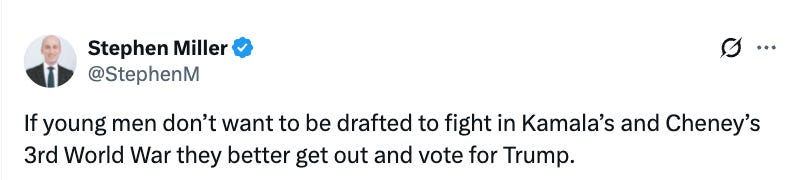 For those of you who are blissfully unfamiliar: during the 2024 election, after Kamala Harris became the nominee, a new reason not to vote blue came out: she was absolutely, definitely going to go to war with Iran—a world war, in fact. Why? Nobody knew. But presumably, she would do it spitefully, in a sort of “male tears mug” Jezebel coded way. It would be Gen Z Boss and an Airstrike, if you will. And not just that—but she was apparently going to reinstate the draft to do it. Per Stephen Miller, “If young men don’t want to be drafted to fight in Kamala’s and Cheney’s 3rd World War they better get out and vote for Trump.”