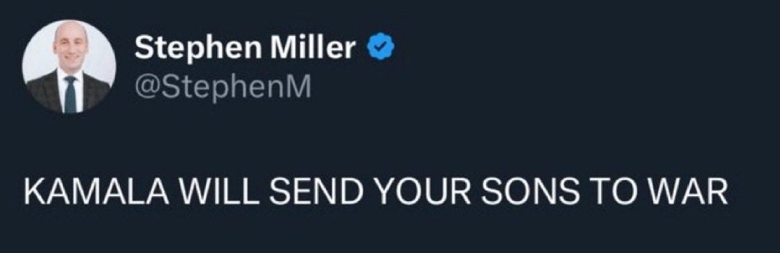 More bluntly, he said “KAMALA WILL SEND YOUR SONS TO WAR.”