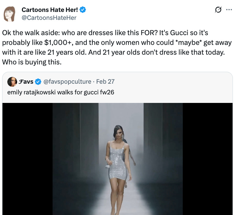 I asked a question because I was confused. Not because she didn’t look good (Emily Ratajkowski would look good in anything) but because for the past year, maybe the past two years, I have been told relentlessly that being “high fashion” or being “cool” in any meaningful way meant NOT WEARING STUFF LIKE THIS. And yes, a runway is “art” in a way that regular fashion isn’t, and I know this dress isn’t currently available in stores, but runway trends trickle down! So I asked: who exactly is such a dress for? The only people who could afford it would probably never wear it. And just as I was about to doze peacefully off to sleep, I became Twitter’s Main Character.