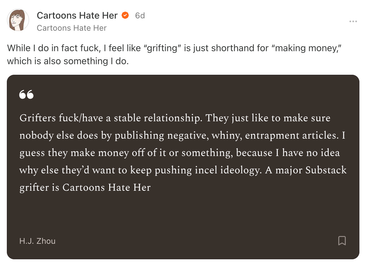 Either way, I’m just not responding to it, linking to it, or engaging with it, not because I don’t care (the fact that I wrote this whole post indicates I do care, at least a little) but because it’s exactly what they want. Maybe some of these people are doing it purely for the love of the game—they’re writing about how much I suck because they truly feel passionate about how terrible my work is. (I would argue if writing about things “nobody cares about” is such a problem, writing about someone who writes about stuff nobody cares about is even less interesting.) But usually, these people are doing this in direct restacks to me, tagging me, linking to me, and doing this in an effect to get me to respond because I’ve shown before that I’m willing to do it. They don’t even care if my response makes them look stupid, because they know it will be blasted to 33,000 people. Negative attention, as any preschooler will tell you, is better than no attention at all, and if you want to get big on Substack you need to get attention. You can get that attention by writing things people enjoy, but if you fail at that, you can also just poke and prod some bigger writer into getting mad at you. I’m not going to be that person anymore.