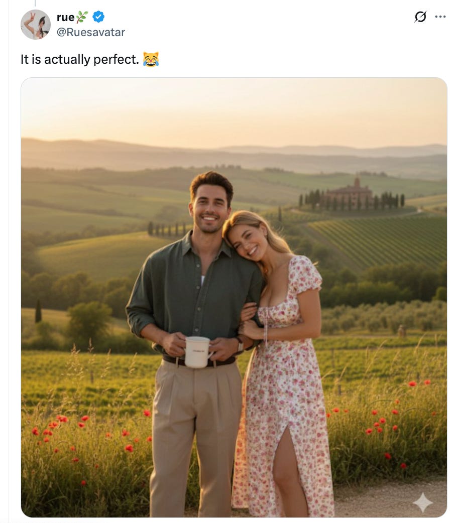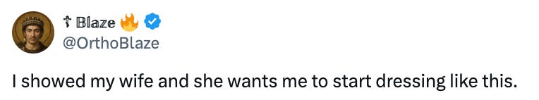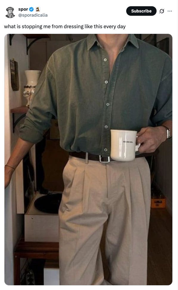 Layers upon layers. Someone said this was “milkmaid dress discourse” but for the gents, and thanks to the wonders of AI, all our too-online delusions are coming to life. Yes. YES!!!