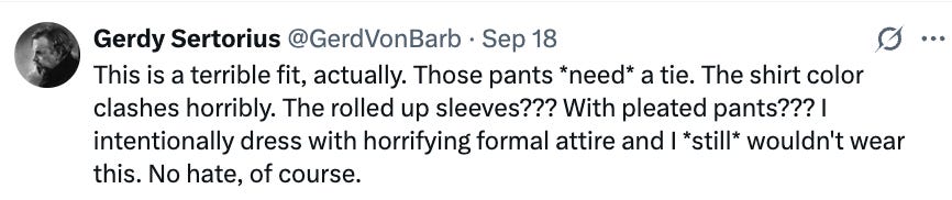 I like it too. I mean, for a WFH, the khakis would be a little odd, but the shirt is nice and dressing up never killed anyone. Most men could—and don’t hate me for this—try a lot harder than they’re currently triyng. But like any fashion-related discussion on Twitter, this one riled people up. And I would know—I was the Main Character thanks to my worst-ever outfit. For some reason, men’s fashion seems much more heated, maybe because men aren’t as afraid of hurting each other’s feelings with fashion critiques.
