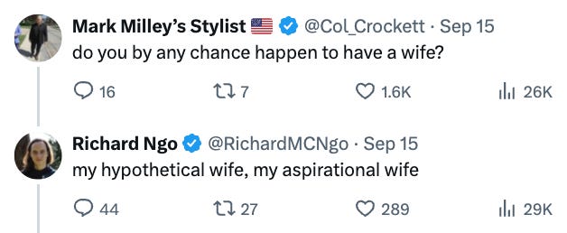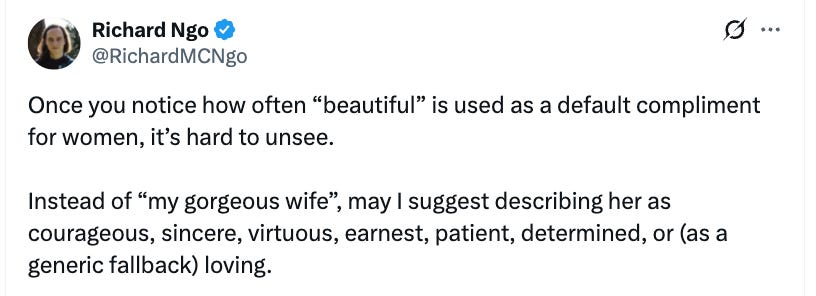 This week, an AI researcher named Richard Ngo suggested that men stop introducing their wives as “my beautiful wife” and instead introduce them with adjectives that focus less on their appearance. We love a feminist ally, or do we?