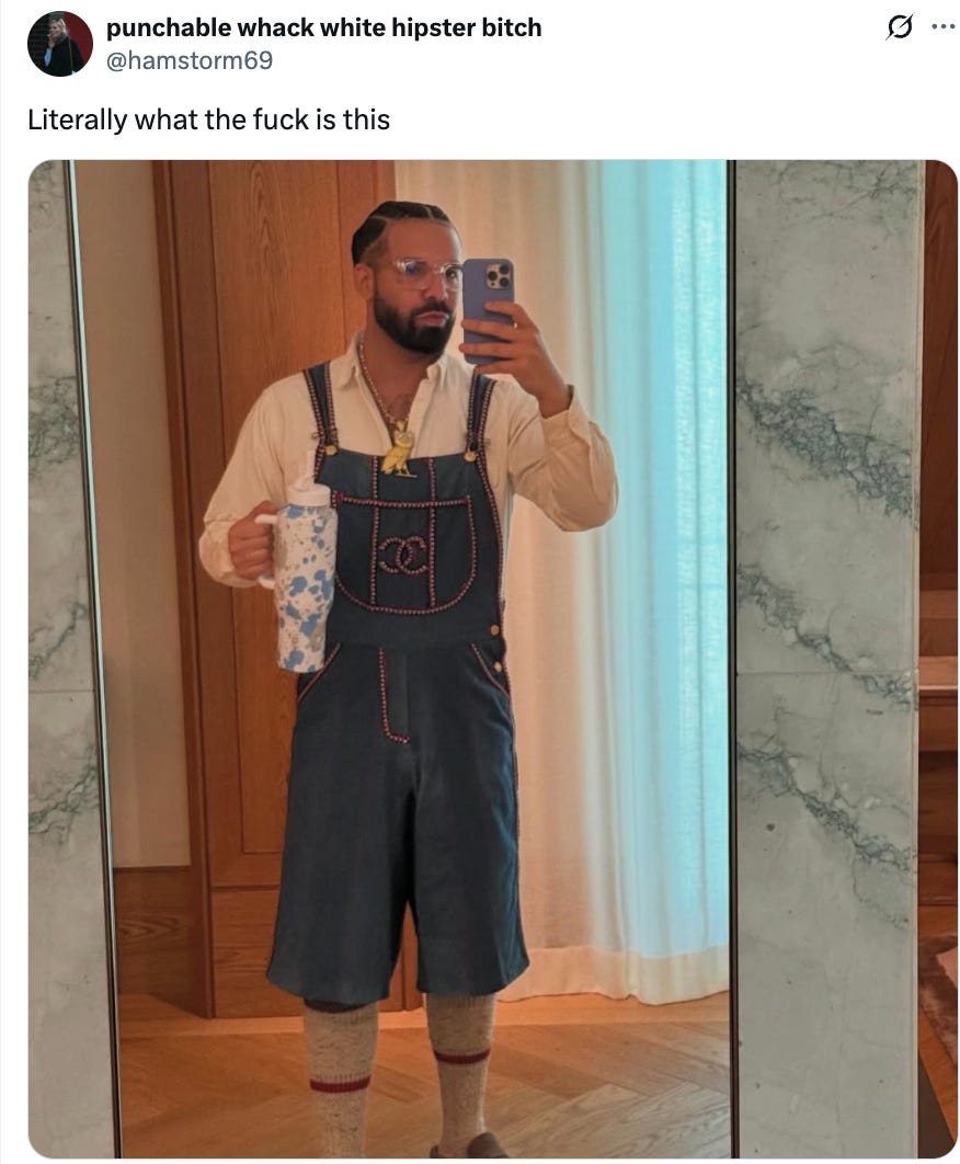 While we’re on the topic of men’s fashion, I might as well cover this. Everyone on Twitter teamed up to make fun of what might be the worst outfit I’ve ever seen, and that’s really saying something. Also, we’re allowed to be mean, because it’s Drake: