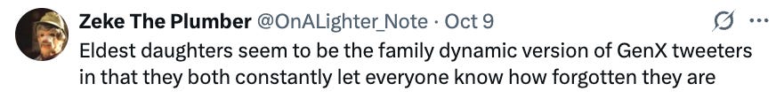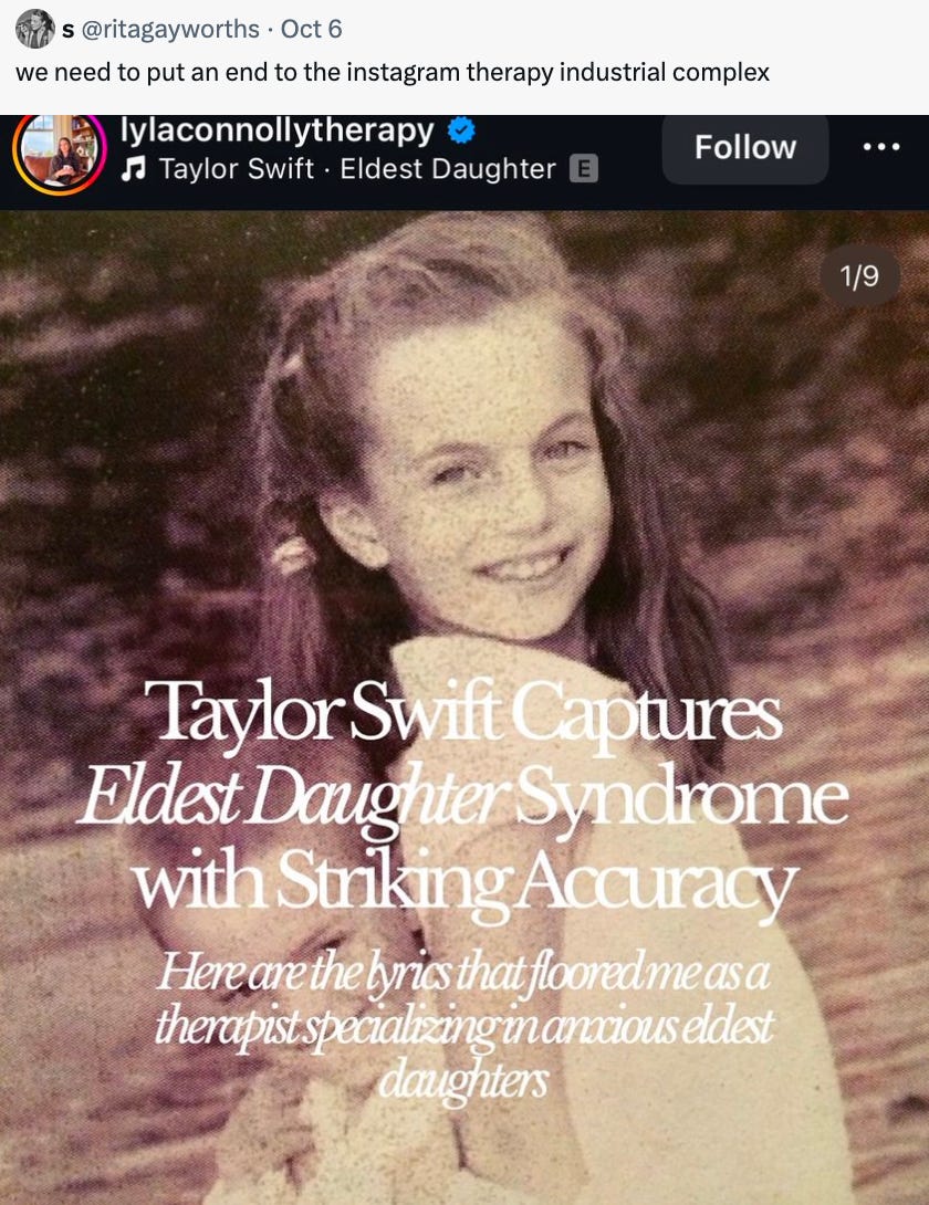 I’m debating writing my own separate post on this (let me know if there’s any desire for that) but Taylor Swift’s new song, Eldest Daughter, is bringing out a lot of feelings for eldest daughters who believe they were victimized by their birth order and gender—generally, that they were held to unreasonably high standards that didn’t apply to the rest of their families, not having a childhood because they were given too much responsibilities, and an obligation to perform domestic labor not expected of their siblings.