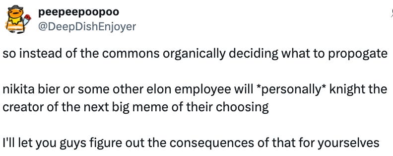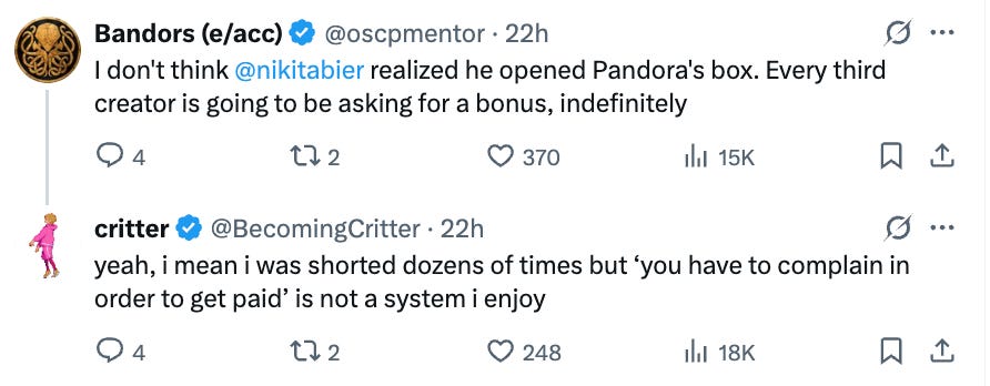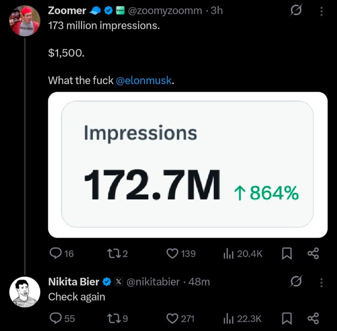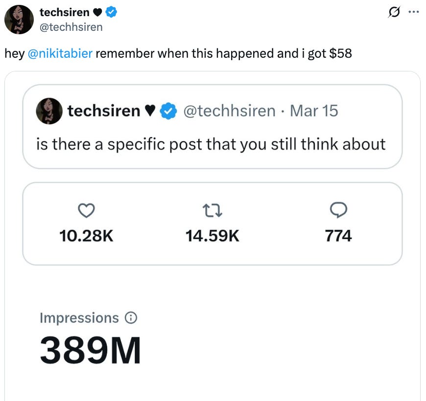 I remember when it happened and I considered posting it to MST, but ultimately decided it wasn’t funny or interesting enough. However, this week it became funny and interesting when Nikita Bier, the head of Product at X/Twitter, gave $10,000 in monetization cash to the guy who posted it after he complained that his monetization payout wasn’t proportional to the impressions of the post.