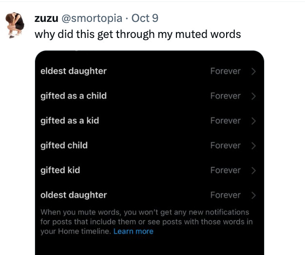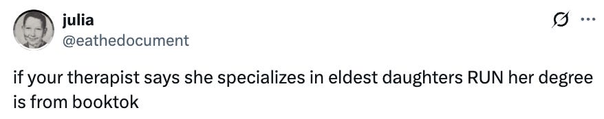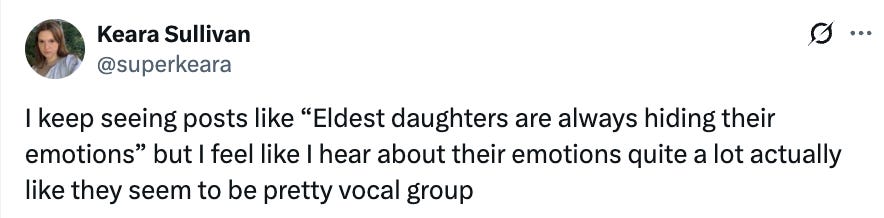 Not to be the Friend Who’s Too Woke, but I feel like the eldest daughter phenomenon is kind of specific to particular cultures, maybe including very large white American families but probably not including white American families with two kids. Sorry! It feels like the latest buzzword that could be used by the majority of women (the only person who doesn’t qualify as the “eldest daughter” is someone with a big sister) to explain what basically amounts to having anxiety and low self esteem. The following criteria could apply to almost anyone who wants to see these traits in themselves. It’s giving “gifted child burnout” or “child of emotionally immature parent” which I wrote about before.
