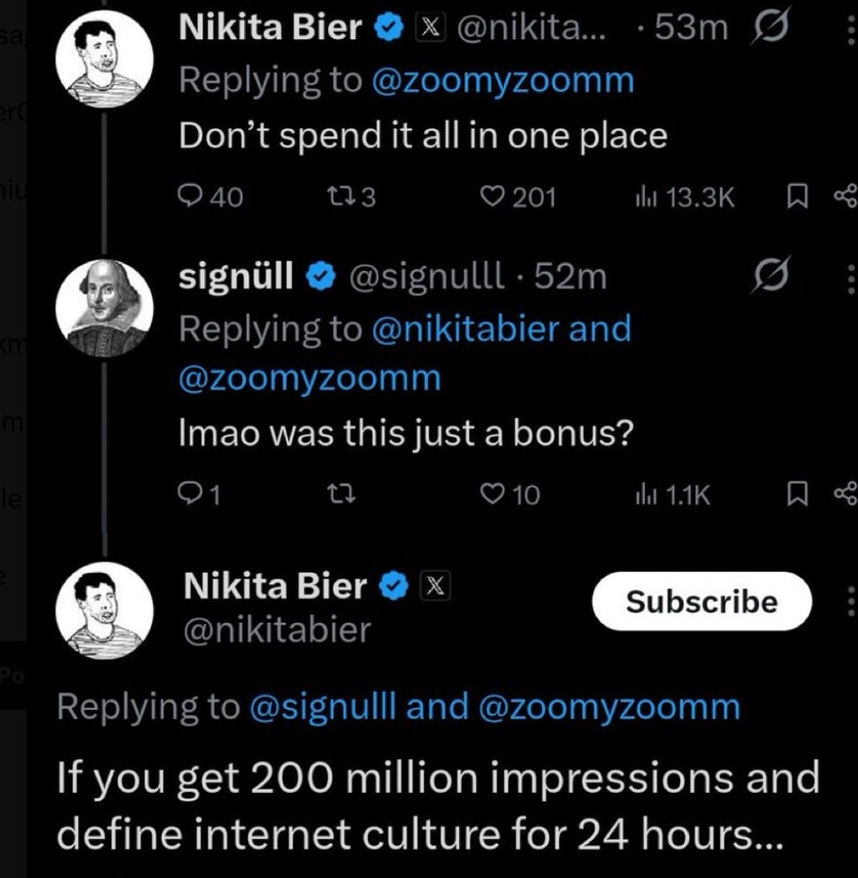 Clearly this was some kind of funny one-time stunt (and a pretty bad idea, I would say) but it opened a Pandora’s Box of other users who went similarly viral, demanding Nikita give them what is rightfully theirs, because ultimately someone winds up “defining Internet culture for 24 hours” every day.