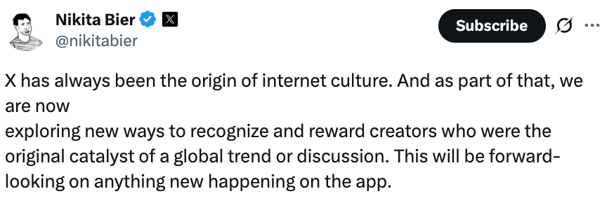 Nikita clarified (vaguely) by saying that they are looking for “new ways” to reward and recognize influential creators. But I assume this also requires you to tag him and beg for more money, which is frankly something I’m not willing to do. Good luck out there!