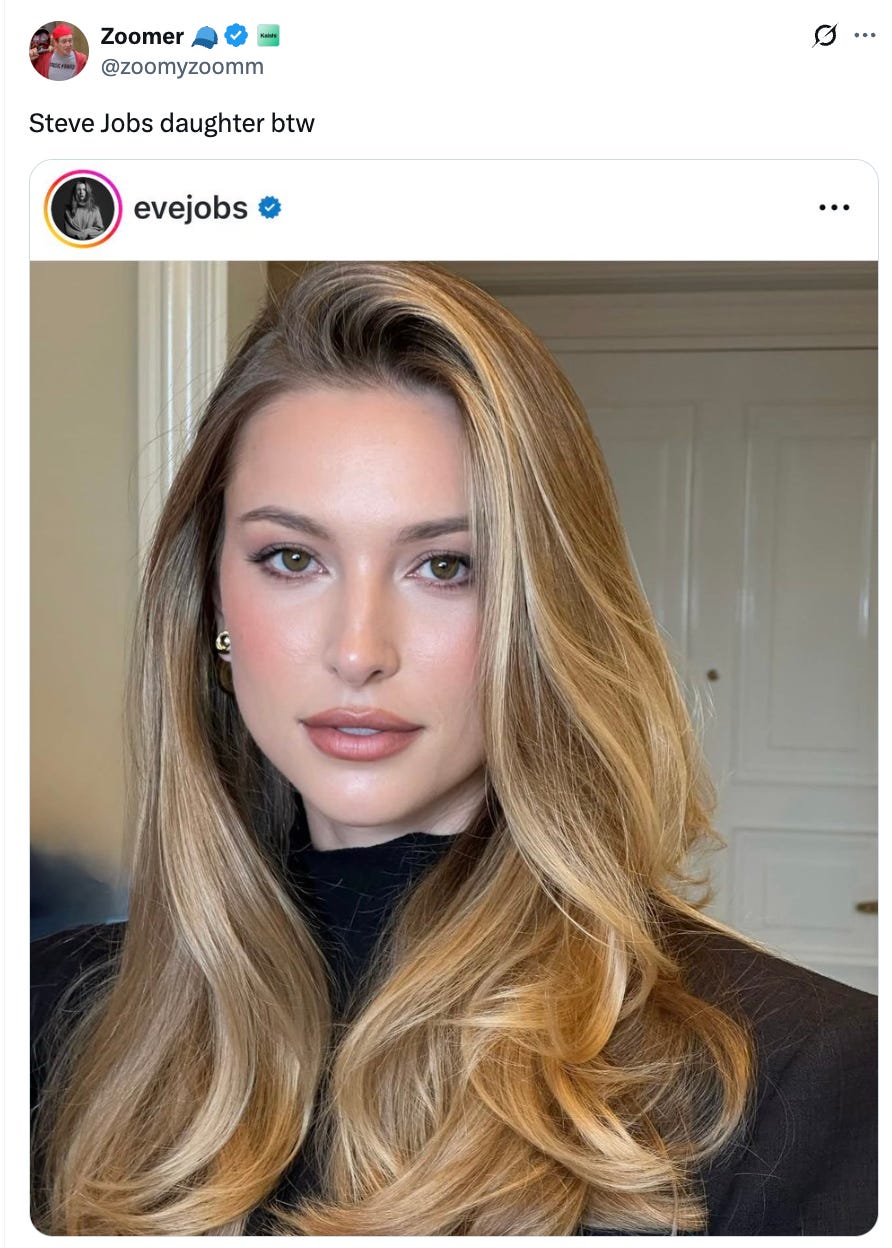 Last week, a Twitter account drew attention to the fact that Steve Jobs had a hot daughter, posting an image from the aformenioned daughter’s (Eve Jobs) Instagram: