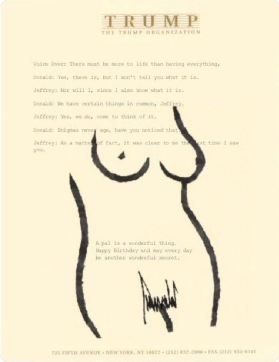 This all comes off the heels of the news breaking that Trump gifted Jeffrey Epstein a “bawdy doodle” for his fiftieth birthday. Honestly, I wasn’t prepared for the artistry of the doodle but it’s not bad. I mean, the signature as pubic hair? Genius. Why couldn’t he have stuck to art and stayed out of politics?