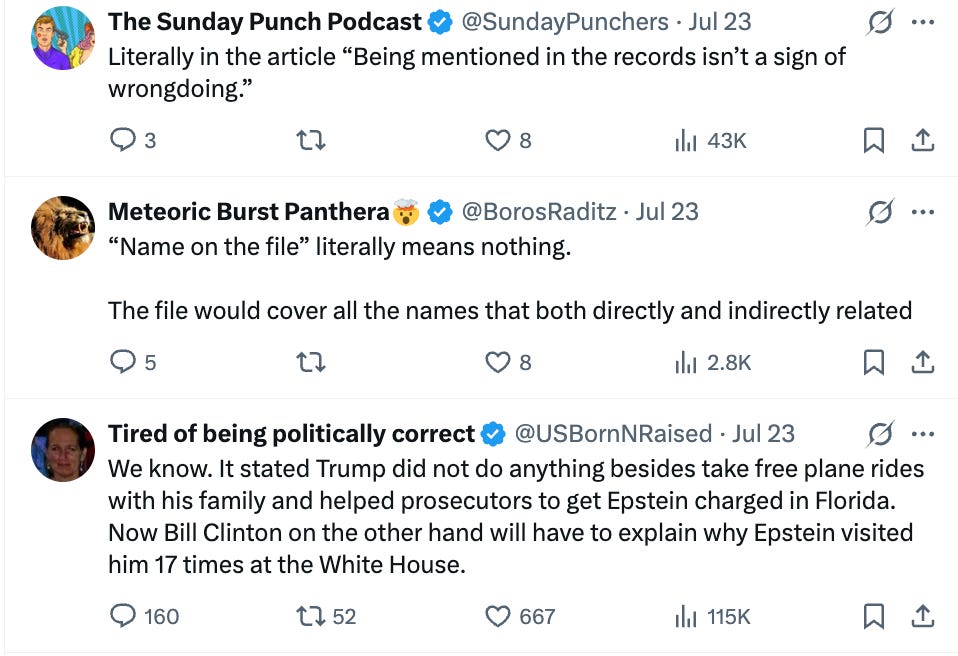 Then I noticed a Wall Street Journal headline about Trump being informed that he was in the “Epstein files.” So I guess it’s real? But alas, maybe it’s not a big deal and Trump, who apparently doesn’t have any money of his own, just wanted some free plane rides: