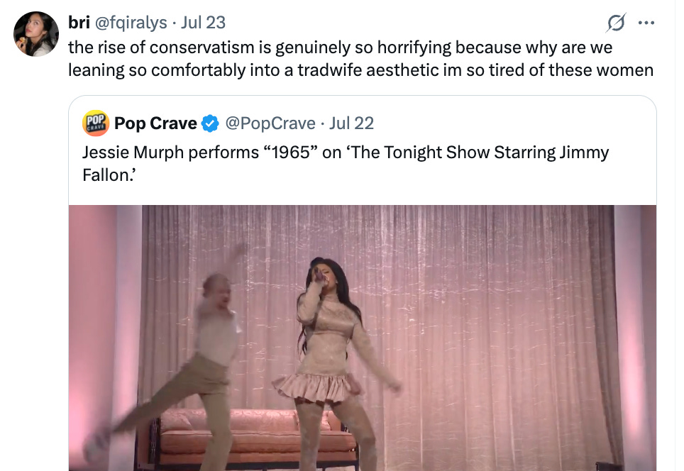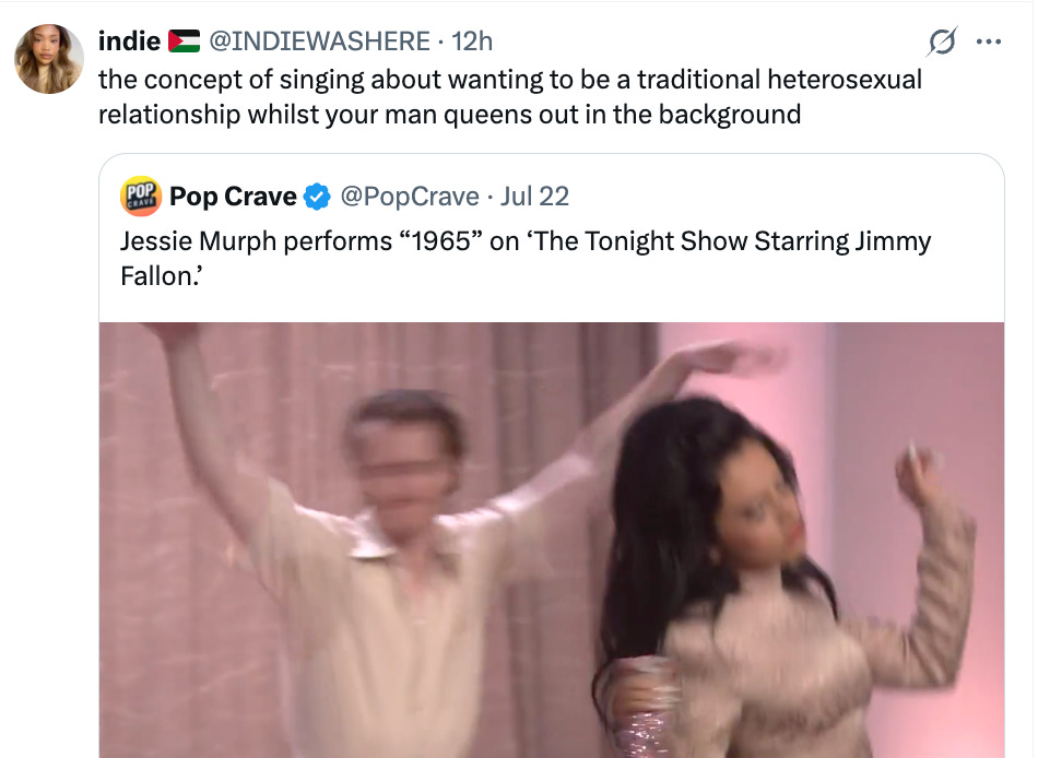 To quote the viral tweet, “Yeah 1965 was a fine song but its politics were a bit iffy. wouldve been way better if at the end Jessie Murph turned to the camera & said "i am liberal feminist now" & then specified shes the exact kind of liberal feminist i am"