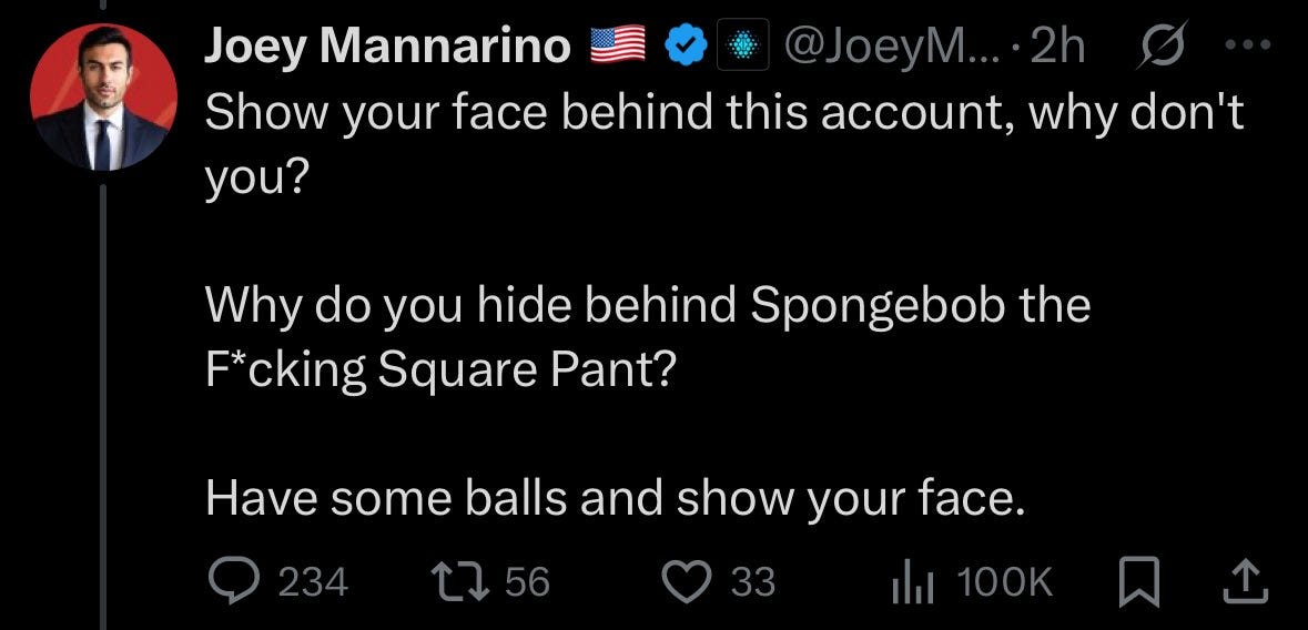 Joey Mannarino slandering Spongebob the F*cking Square Pant on the anniversary of the day he was exposed as pretending to be a Black woman. Second lore drop: at one point he was mistaken for Luigi Mangione.