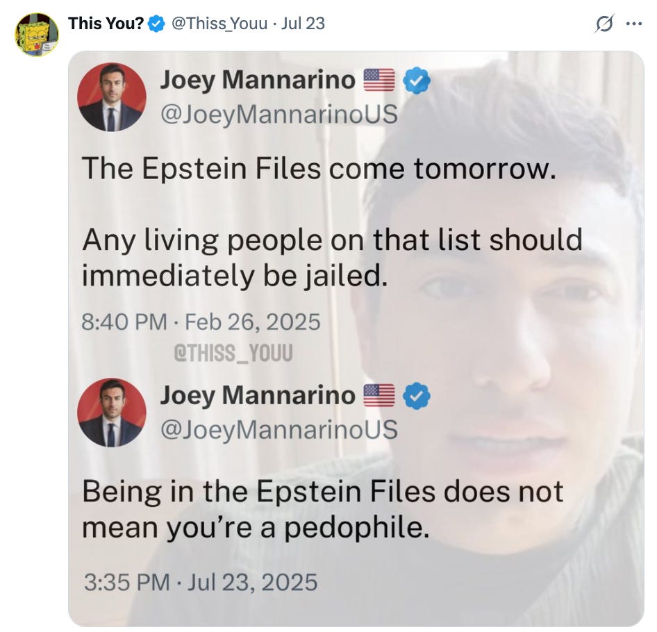 The main reason I started thinking that maybe the Epstein files were real was the fact that all the right-wing accounts started claiming it was no big deal to be in them. Uh oh!
