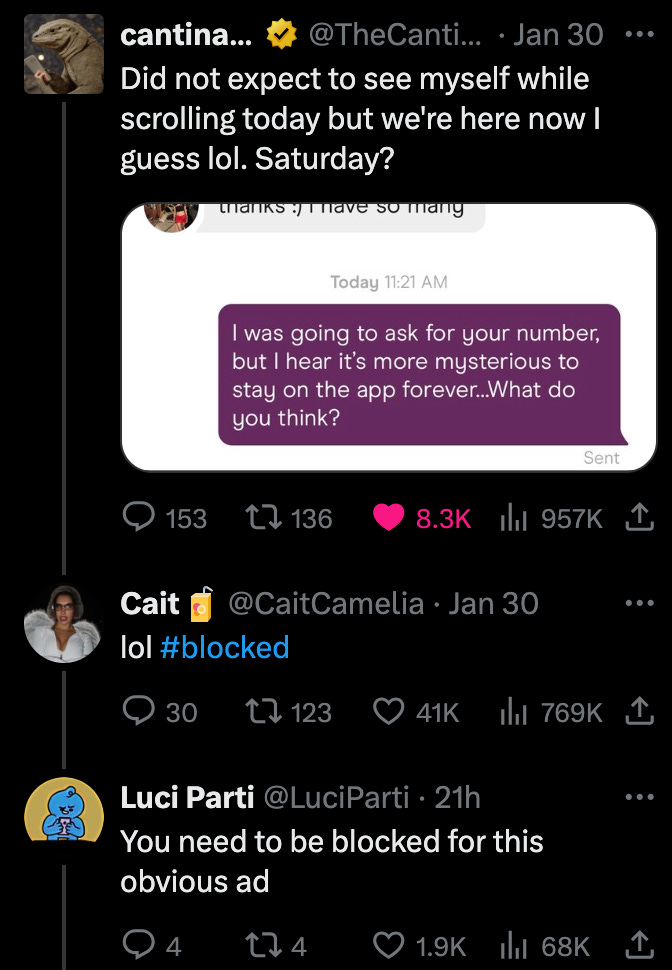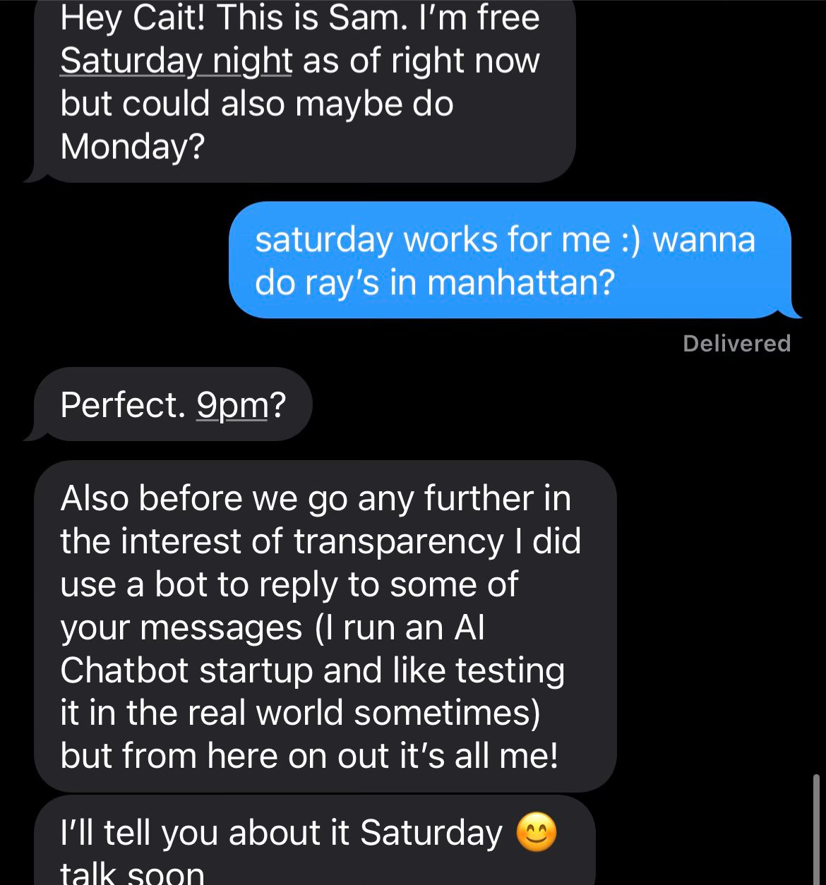 This week, a Twitter user named Cait blasted her would-be date on Hinge for using a chatbot (something he proudly revealed to her unprompted) in order to secure her phone number.
