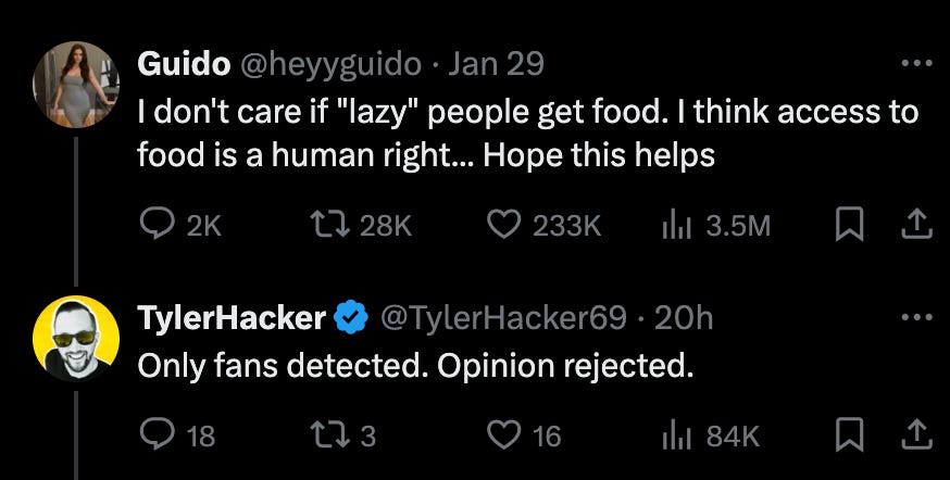 It’s been a while since we got a good “this you?” Normally, it’s someone pulling up some years-old tweet that was clearly a joke and not particularly bad anyway. But we got a great “this you?” this week when a guy argued that food isn’t a human right because the person saying this had an Onlyfans account: