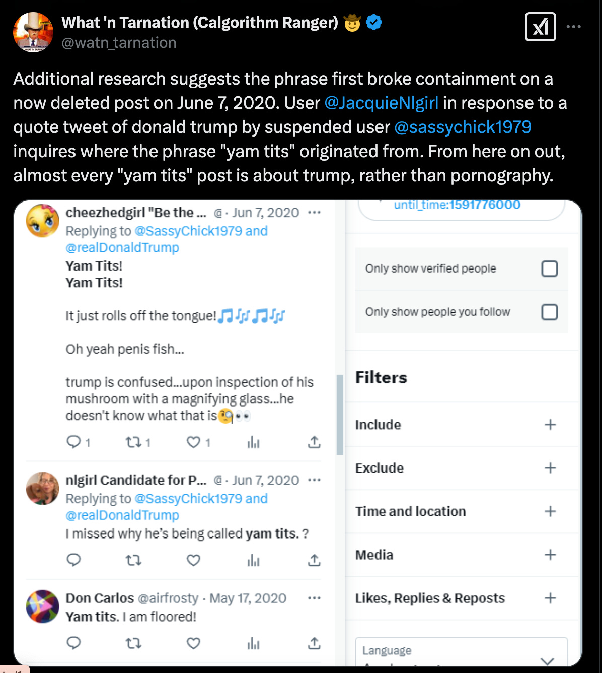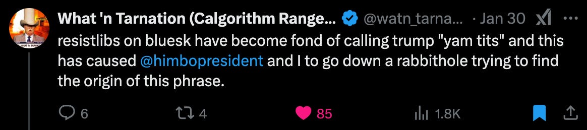 A Twitter mutual of mine randomly became fascinated with the origin of the resist lib nickname for Donald Trump, “Yam Tits.”