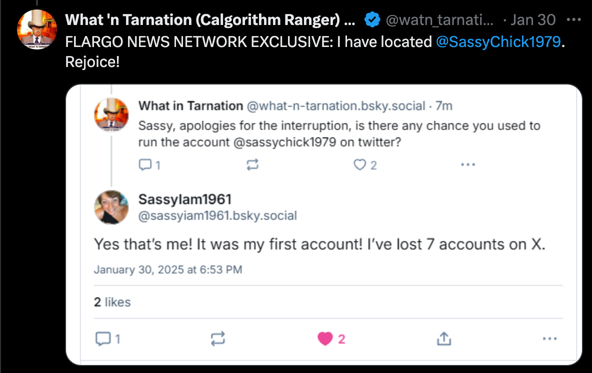 They eventually tracked down the current username of the woman who previously went by sassychick1979, who has apparently been suspended from X seven times. Queen!