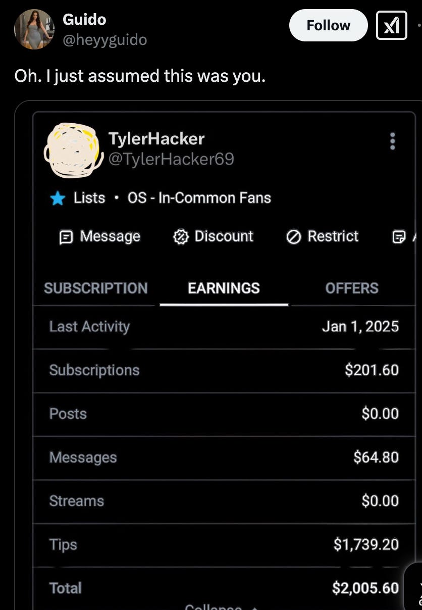 Not only was he a paying patron of OnlyFans, but he allegedly spent $2000 on porn from the precise woman whose opinion he invalidated on the basis that she had OnlyFans in her bio. I mean, this is just too perfect.