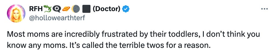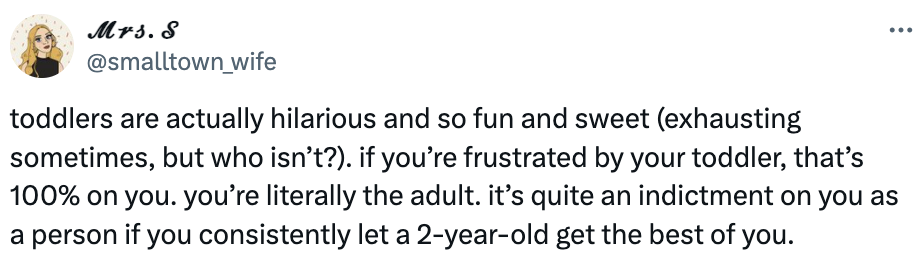 Anyway, this was the moment when the discourse left the fringey weird dissident right and entered into the sphere of Mom Twitter. The gateway, of course, was Christian/trad mom Twitter with this tweet about how there’s something wrong with you if you ever get annoyed or frustrated by something your toddler does: