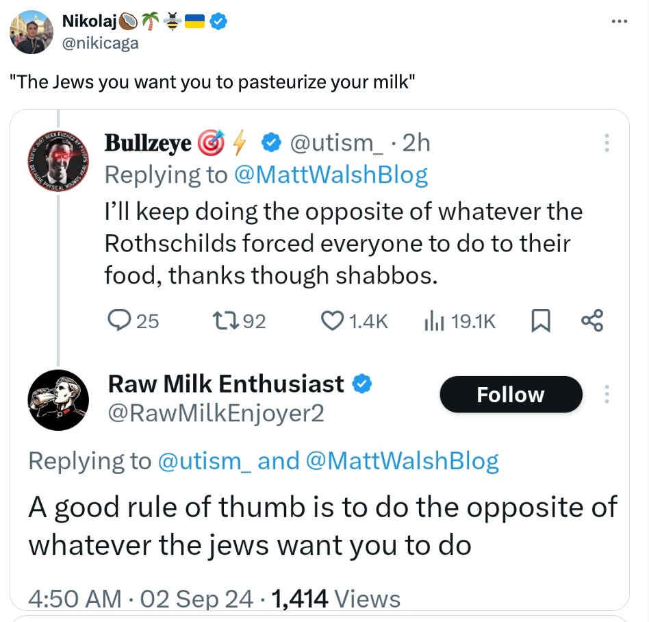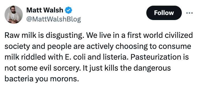 Shockingly, this provoked a rebuke from far-right commentator Matt Walsh, who seems like exactly the kind of person who would drink raw milk: