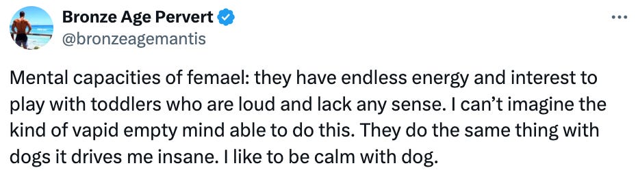 There must be something wrong with my algorithm because all I’m seeing is right wing content these days. Notably, this tweet from right wing darling Bronze Age Pervert, asserting that women’s ability to play with toddlers for long periods of time means that they don’t have the same mental capacity as men: