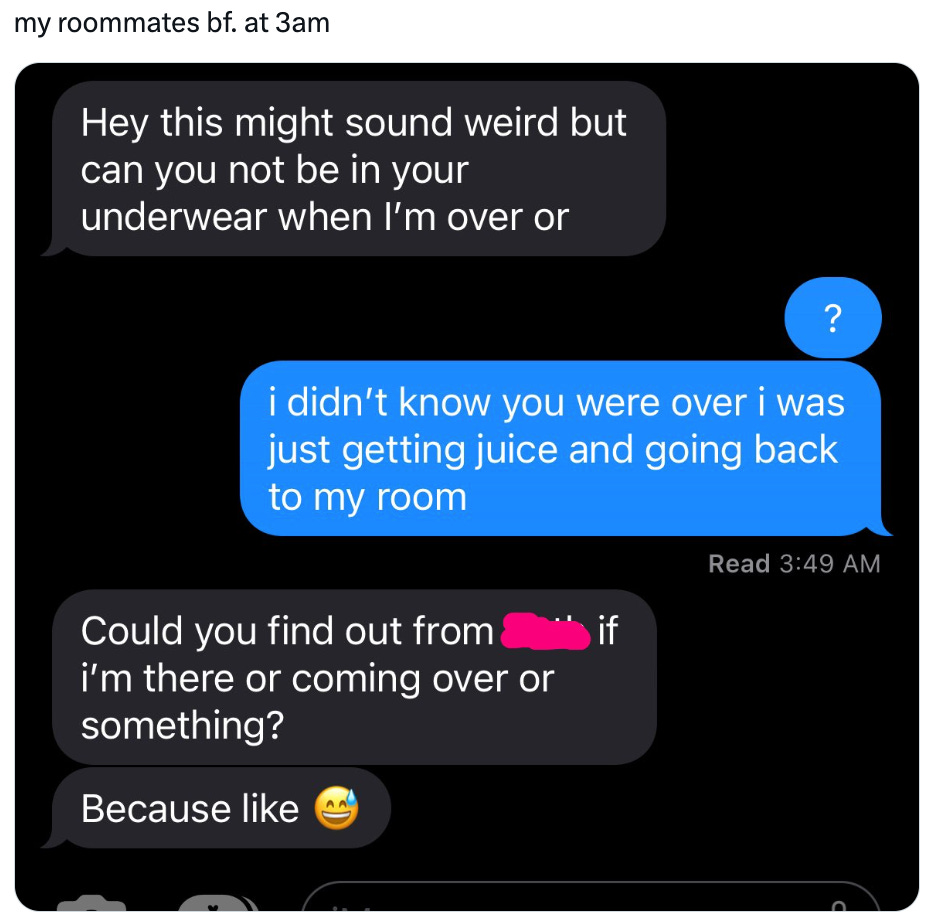 On September 6, a Twitter user posted a text exchange between her and her roommates’s boyfriend. Apparently, he texted her at 3 AM to let her know not to be in her underwear when he’s over.