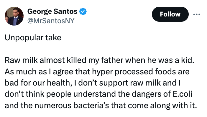 Just as things were starting to get a bit stale, renowned former Congressman and current cartoon villain George Santos showed up to endorse Matt Walsh’s view of pasteurization: