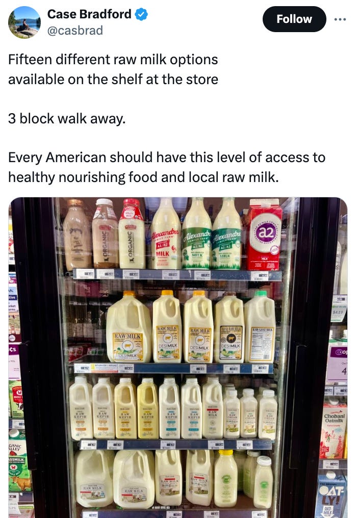 Of course, the opposite of raw milk is pasteurized milk, and that just means the milk was heated ahead of being bottled which would kill harmful bacteria. It feels relevant to note that in the past, people on crunchy right-wing Twitter have said things like, “How could raw milk be dangerous if you boil it before storing?” which is literally the definition of pasteurization.