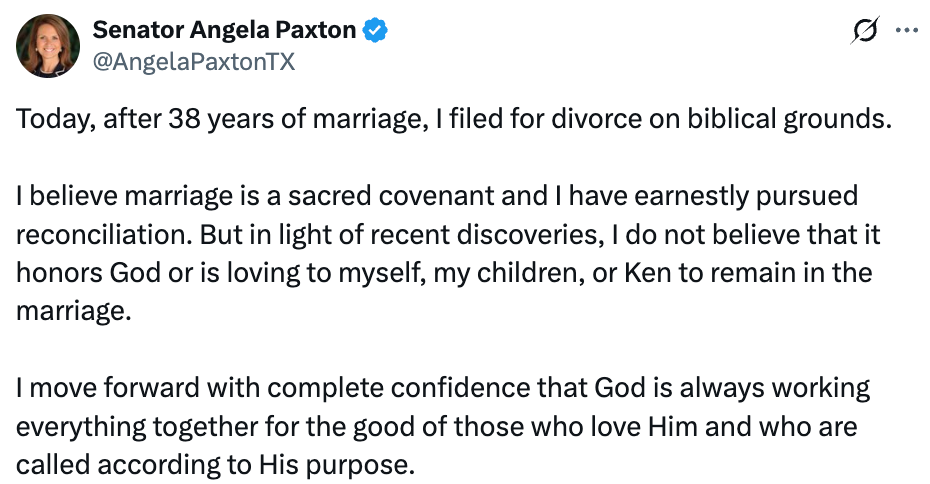 AG Ken Paxton’s wife took to Twitter this week to announce she was filing for divorce from her husband on “biblical grounds” citing “recent discoveries.”