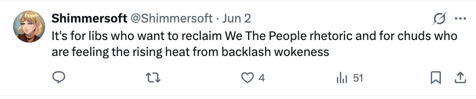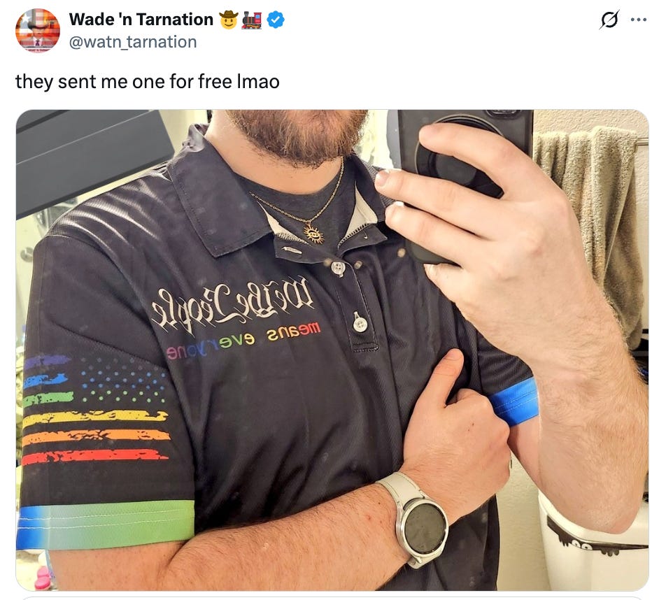 An online friend of mine, who we’ll just call “Wade,” saw a perplexing ad for some pride-themed shorts that are otherwise very right-winger-coded. It includes a rainbow-colored American flag at the bottom that says “We the People.”