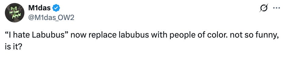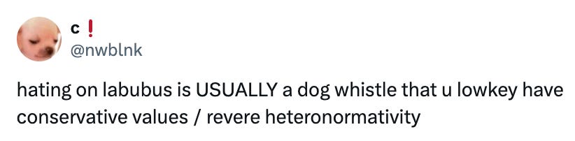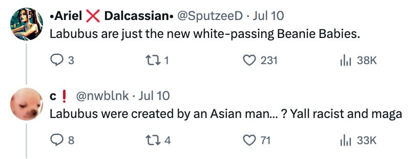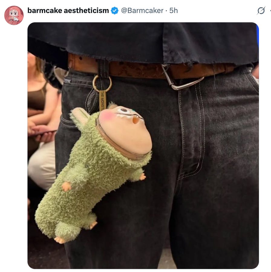 Maybe I don’t have this right, and this is because I’m almost 36, but I’m vaguely aware of some ugly grinning doll/stuffed animal things that fashionable young people are carrying around with them. They are called Labubus. And also, if you hate them, you my be a racist: