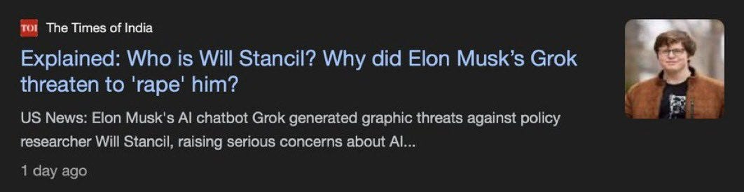 At this point, Grok began directing graphic rape threats at liberal Twitter personality Will Stancil (who I previously interviewed about being the “most hated man of Twitter and Bluesky.) Will Stancil is no stranger to online arguments, trolling and harassment, but this was the first time he received sexual threats from a robot. I won’t repost the initial rape threats but they were fairly graphic and Will has indicated he may be taking legal action. But now we have headlines like this from Times of India: