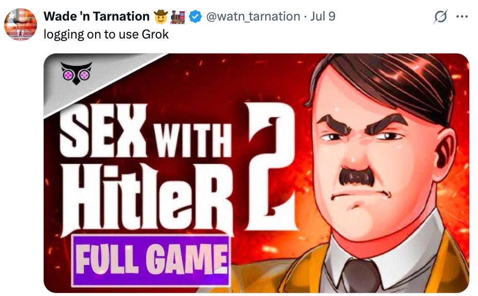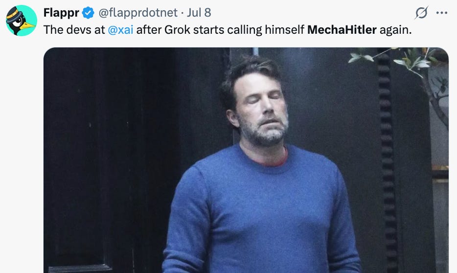 How do I even explain MechaHitler? Well, I’ll put it this way. If you’re not on Twitter anymore, any using Many Such Takes as a way to vaguely understand what’s happening there, this will probably make you feel really good about your decision.