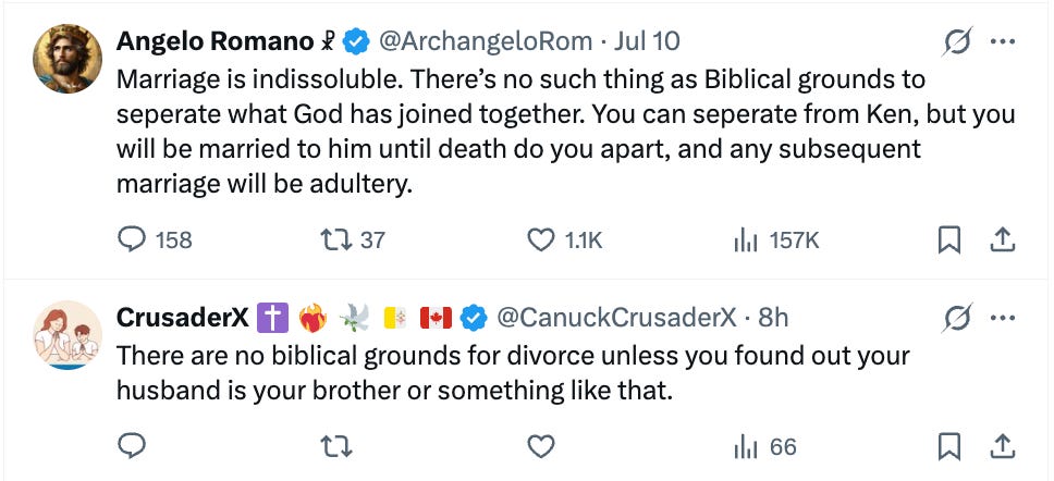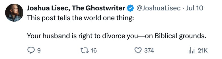This was not seen fondly by trad Twitter, who suggested that while it was immoral for her to divorce her husband for any reason, this tweet alone means her husband should divorce her first, or something: