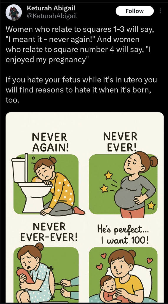 One of the wackiest members of tradwife Twitter (who I believe grew up in the woods with ten siblings and doesn’t have a social security number? Don’t quote me on that) decreed that moms who have unpleasant pregnancies hate their babies.