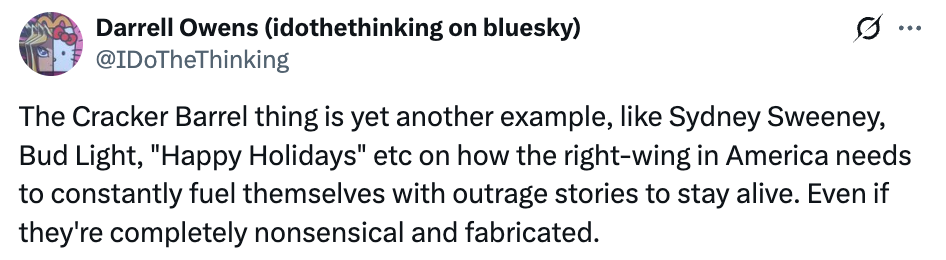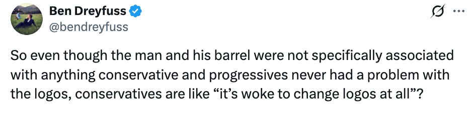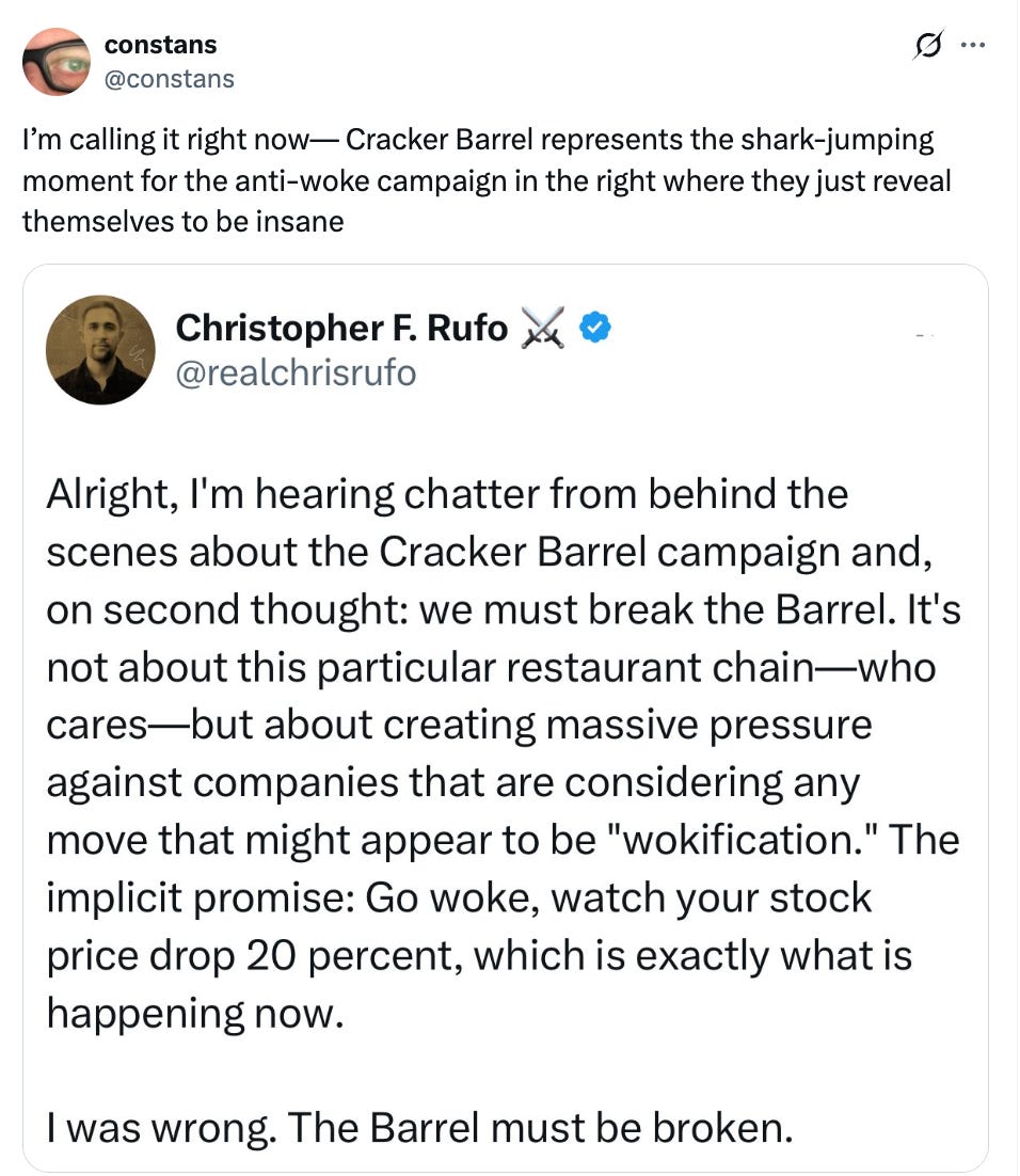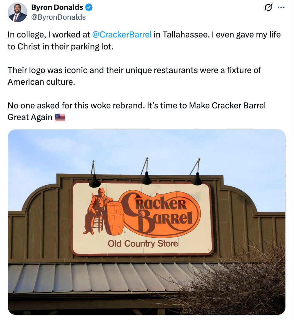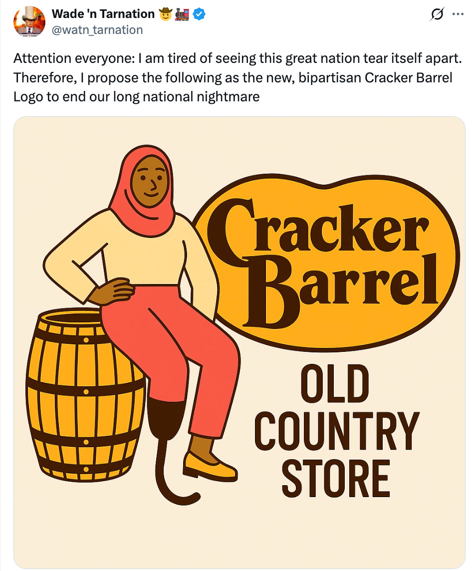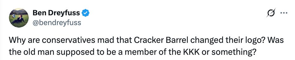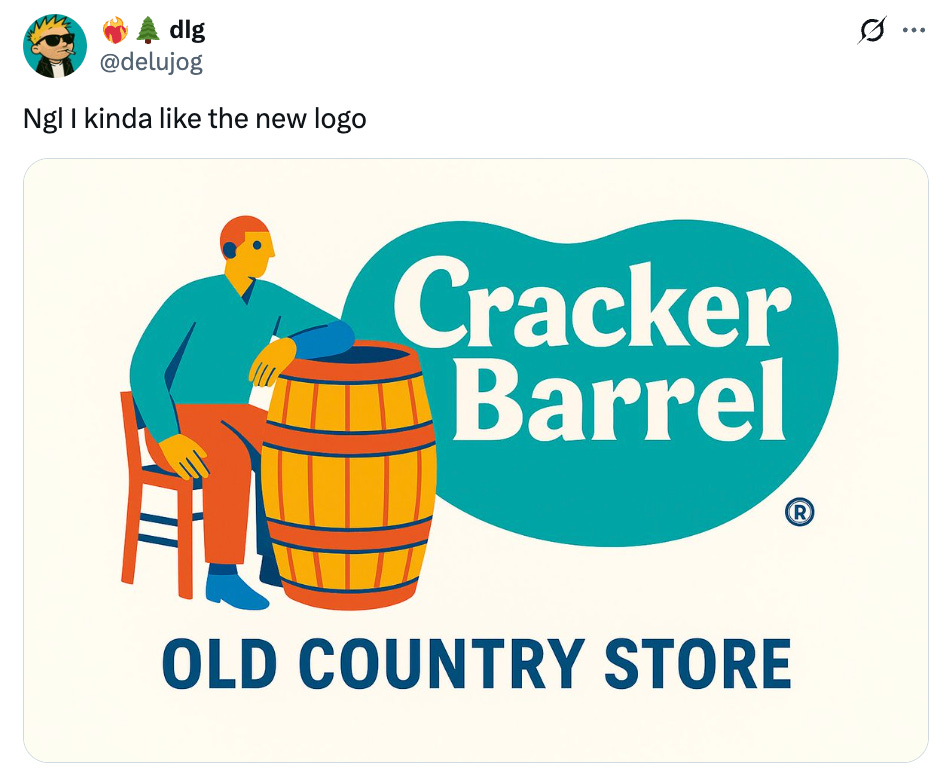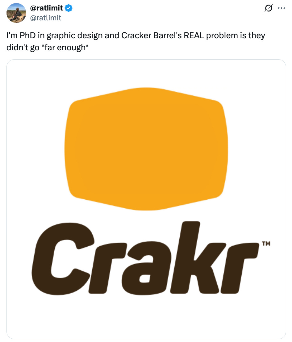 I had briefly seen whisperings about how the Cracker Barrel logo was given a “woke” redesign, so I assumed it included some kind of marginalized people or whatever, but as it turns out, it just got simplified and erased the old man, which if anything, is ageist and eugenicist!