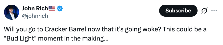 But conservatives were mad, including this guy who gave his life to Christ in a Cracker Barrel parking lot: