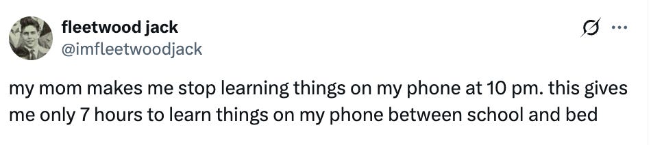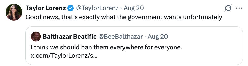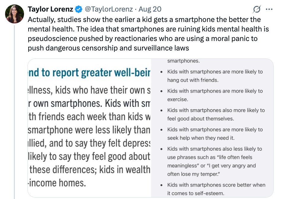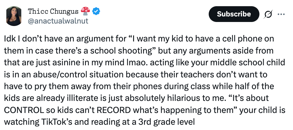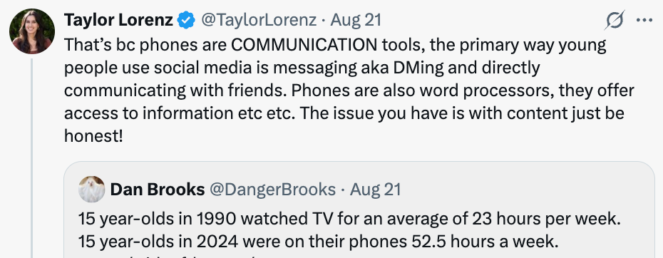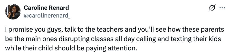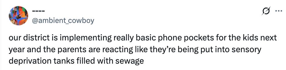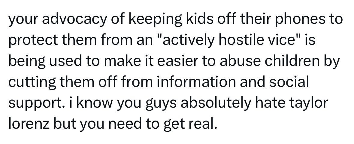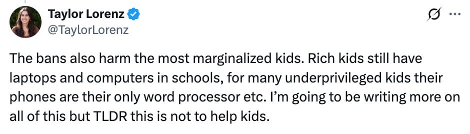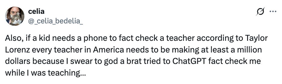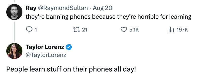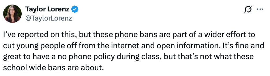 Unsurprisingly, Taylor Lorenz (who has been, I would say, openly pro-phone) took the stance that it was necessary for kids (especially poorer or marginalized kids) to have phones in class, mostly because phones would be a way for them to access information.