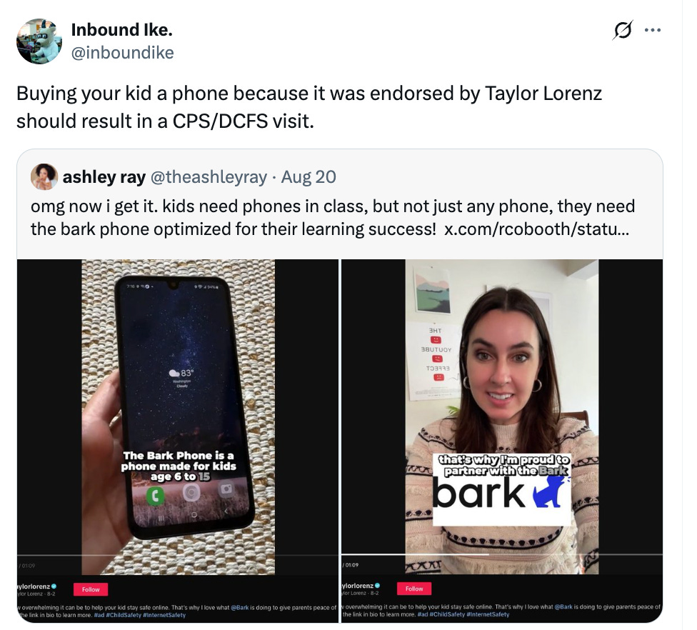 But things got more heated when writer Benjamin Ryan uncovered what appeared to be a sponsored video for the Bark phone featuring Lorenz. The Bark phone is a social media-free phone for children as young as six which is said to enhance learning and facilitate socializing with friends.